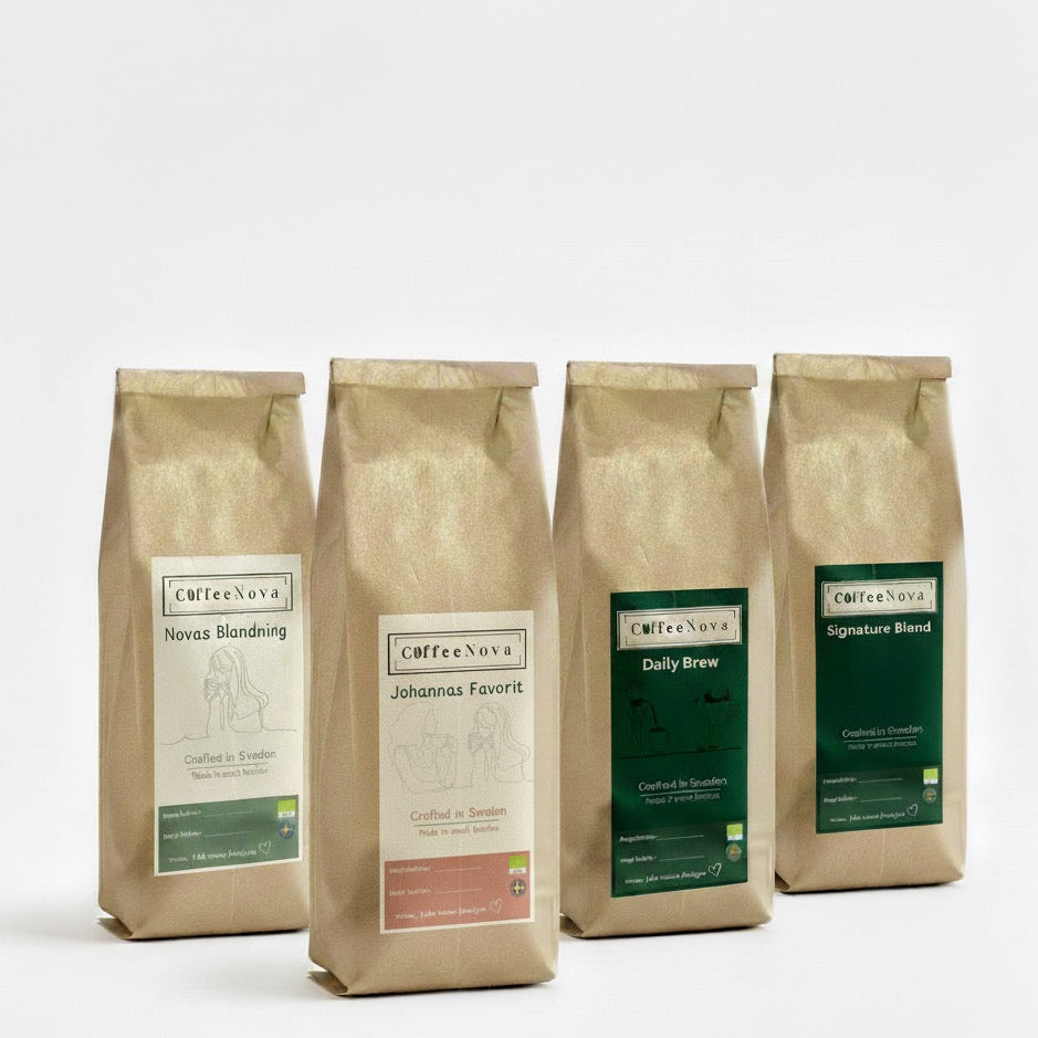 Single Origins Pack Fyra ursprung. Fyra personligheter. Ett paket. Single Origins Pack är ett noggrant sammansatt kaffepaket för dig som vill utforska single origin-kaffets bredd och djup. Här samlas fyra unika kaffen från olika delar av världen – alla med sin egen karaktär, rostningsgrad och smakprofil. Perfekt för dig som vill variera din kaffestund, hitta en ny favorit eller helt enkelt uppskatta riktigt bra kaffe, varje dag. I paketet ingår: Daily Brew – Mexiko | MellanrostEtt mjukt och balanserat kaffe skapat för att fungera lika bra morgon som eftermiddag. Med nötiga toner, mild kropp och naturlig sötma är Daily Brew ett lättdrucket kaffe med len karaktär och varm, avrundad eftersmak – ett självklart vardagskaffe. Signature Blend – Colombia | MörkrostEtt kraftfullt och djupt kaffe med tydlig karaktär. Den mörka rostningen ger fyllighet, robust kropp och en lång, varm eftersmak. Smaken är intensiv men balanserad, vilket gör det lika njutbart som espresso som i mjölkbaserade drycker. Novas Blandning – Etiopien | Lätt–mellanrostEtt livligt och uttrycksfullt kaffe med fruktiga och friska toner. Den lätt–mellanrostade profilen bevarar ursprungets naturliga syra och elegans, vilket ger en klar, uppiggande kopp med lätt kropp och ren eftersmak – perfekt för dig som gillar ett mer nyanserat kaffe. Johannas Favorit – Guatemala | MellanrostEtt mjukt, runt och harmoniskt kaffe med chokladiga toner och tydlig nötighet. Mellanrostningen framhäver sötma och balans, vilket gör detta till ett fylligt men lättdrucket kaffe som passar lika bra till frukost som till en lugn stund under dagen.